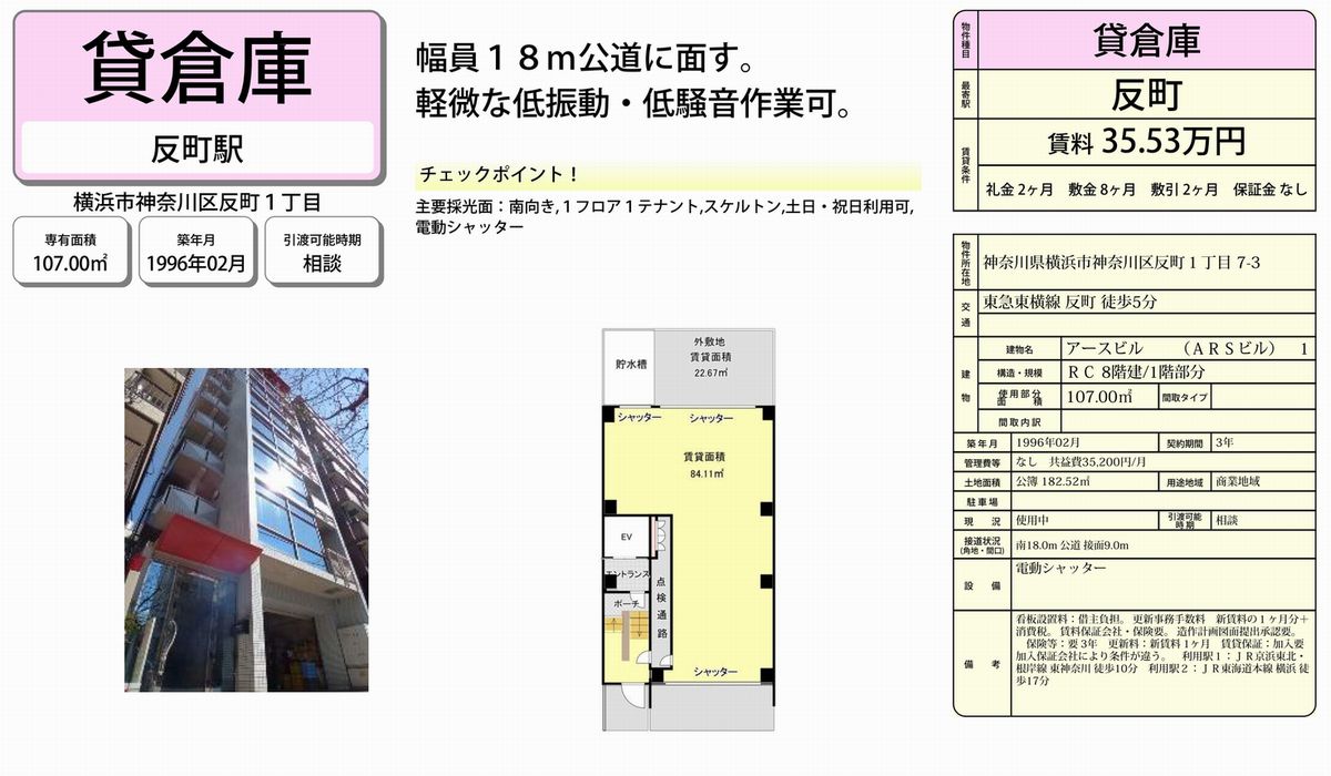 神奈川県横浜市神奈川区反町1-7-3(神奈川県)の貸し倉庫・貸し工場をはじめ神奈川全域の貸し倉庫・貸し工場を検索できます。横浜市神奈川区反町1-7-3(神奈川県)の事務所付貸倉庫、クレーン付工場、店舗倉庫、工業専用地域等、ニーズに合わせて簡単検索。横浜市神奈川区反町1-7-3(神奈川県)の貸し倉庫・貸し工場を貸したい方にはオーナーサポートシステムで無料にて査定・掲載いたします。横浜市神奈川区反町1-7-3(神奈川県)で貸し倉庫・貸し工場をご契約のテナント様には貸し倉庫・貸し工場の設計変更、造作のご相談・施工も承ります。貸し倉庫・貸し工場で移転・新規開設をするなら神奈川地区最大級のテナント.com! |