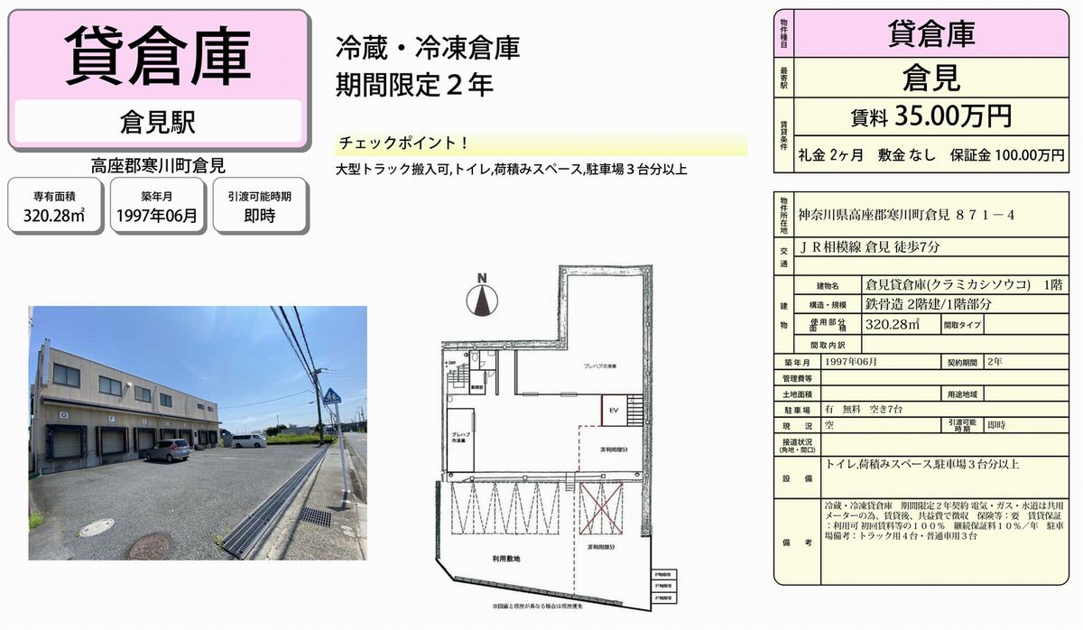 備考 | 冷凍冷蔵倉庫 トイレ 駐車スペース有 トラック用4台 期間限定 |