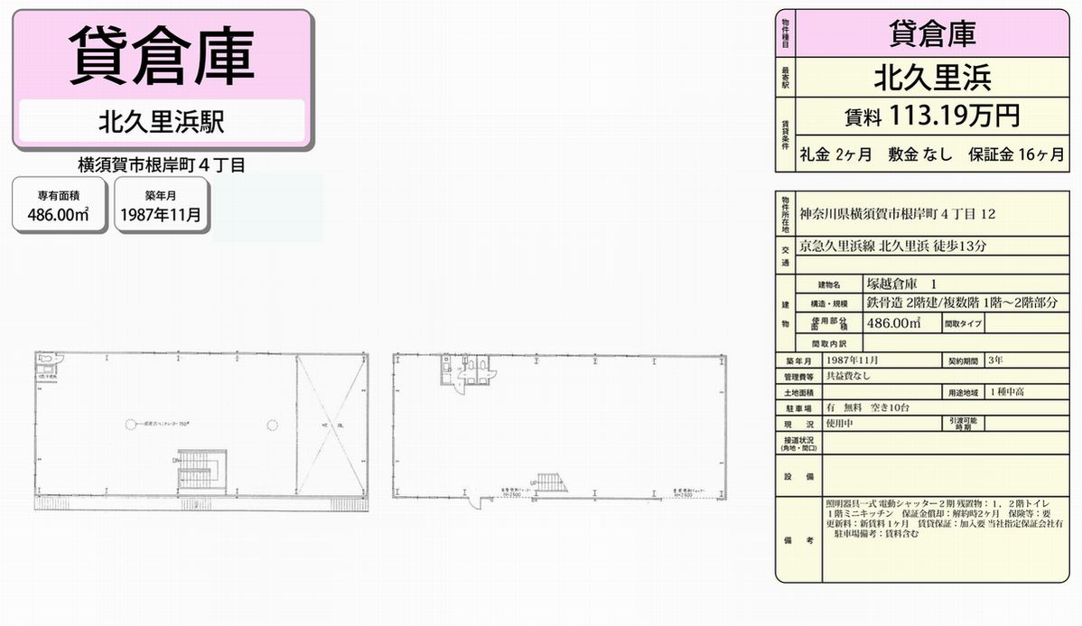 神奈川県横須賀市根岸町4-12 (北久里浜) 塚越倉庫 詳細データ