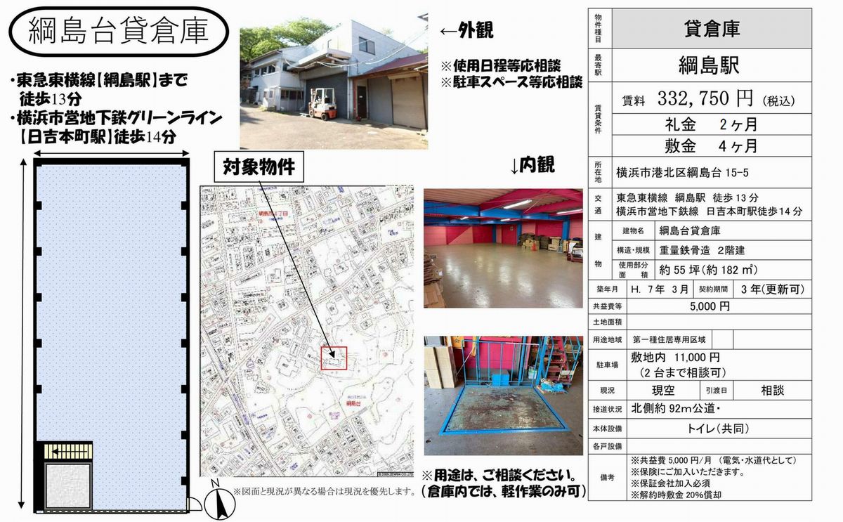 神奈川県内の貸し倉庫・貸し工場の情報満載(トップ) > 神奈川のエリアで探す > 横浜市港北区 > 綱島 > 横浜市港北区綱島台15-5 綱島 貸倉庫