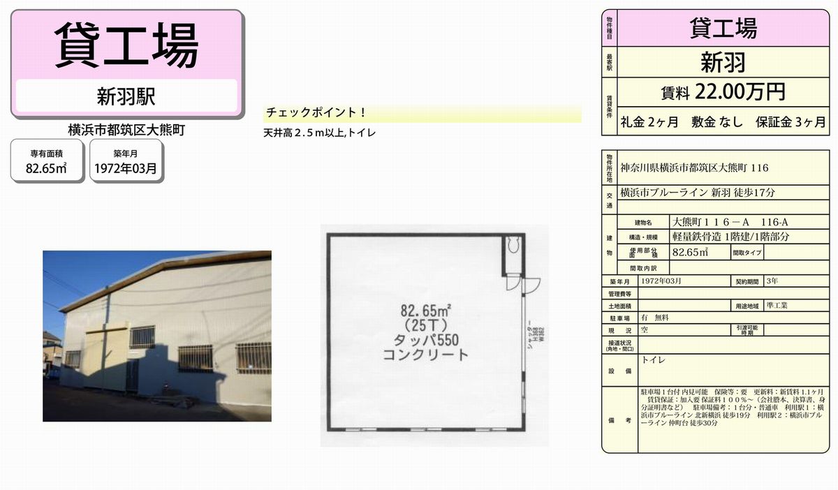 神奈川県横浜市都筑区大熊町116 (新羽) 新羽 貸工場A 詳細データ
