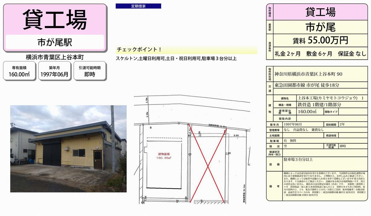 神奈川県内の貸し倉庫・貸し工場の情報満載(トップ) > 神奈川のエリアで探す > 横浜市青葉区 > 市が尾 > 横浜市青葉区上谷本町90 上谷本工場