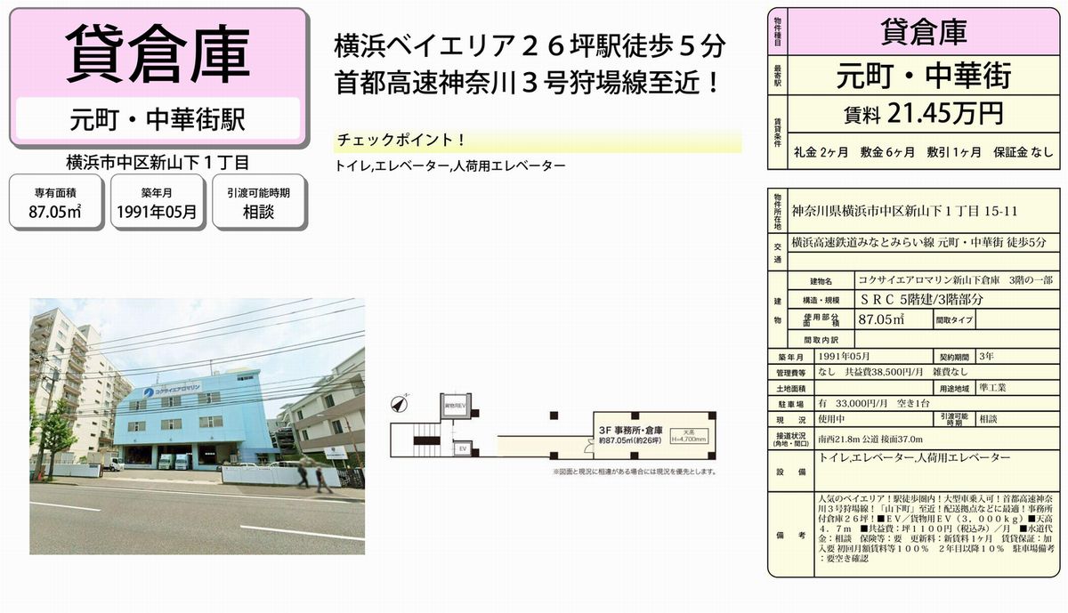 神奈川県内の貸し倉庫・貸し工場の情報満載(トップ) > 神奈川のエリアで探す > 横浜市中区 > 元町・中華街 > 横浜市中区新山下1-15-11 コクサイエアロマリン新山下
