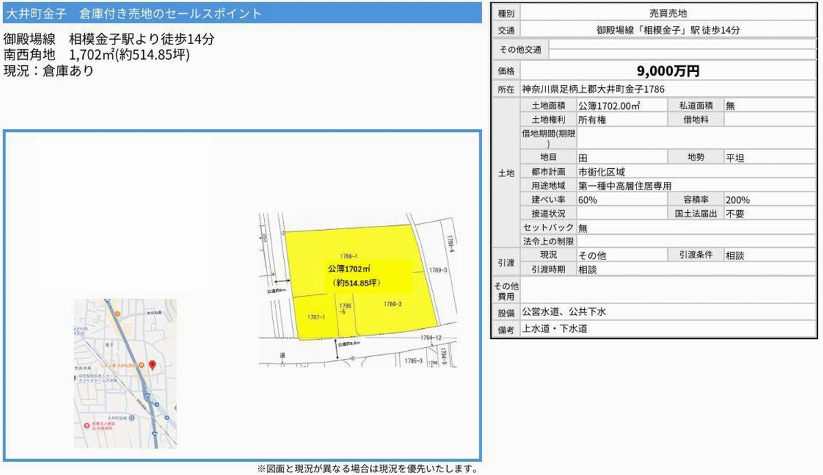 神奈川県足柄上郡大井町金子1786 (相模金子) 相模金子 売倉庫 詳細データ