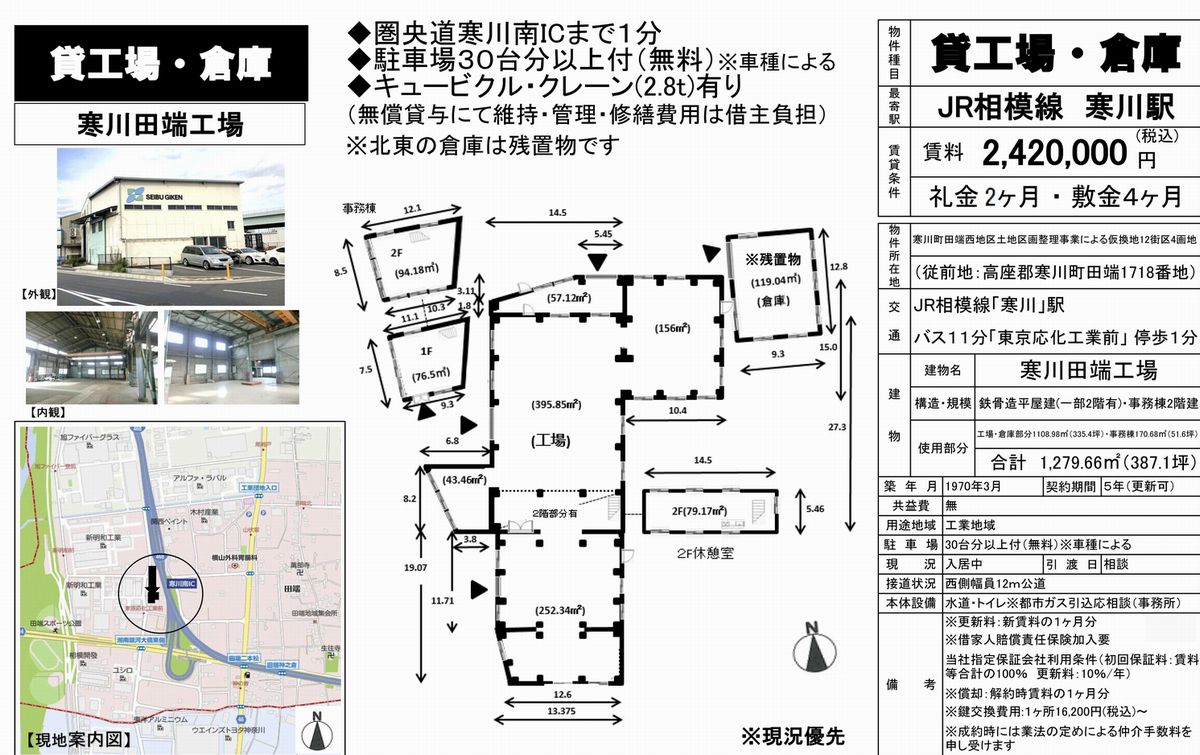 神奈川県高座郡寒川町田端1718(神奈川県)の貸し倉庫・貸し工場をはじめ神奈川全域の貸し倉庫・貸し工場を検索できます。高座郡寒川町田端1718(神奈川県)の事務所付貸倉庫、クレーン付工場、店舗倉庫、工業専用地域等、ニーズに合わせて簡単検索。高座郡寒川町田端1718(神奈川県)の貸し倉庫・貸し工場を貸したい方にはオーナーサポートシステムで無料にて査定・掲載いたします。高座郡寒川町田端1718(神奈川県)で貸し倉庫・貸し工場をご契約のテナント様には貸し倉庫・貸し工場の設計変更、造作のご相談・施工も承ります。貸し倉庫・貸し工場で移転・新規開設をするなら神奈川地区最大級のテナント.com! |