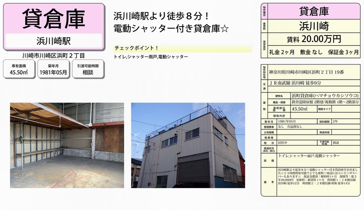 神奈川県川崎市川崎区浜町2-19 (浜川崎) 浜町貸倉庫 詳細データ