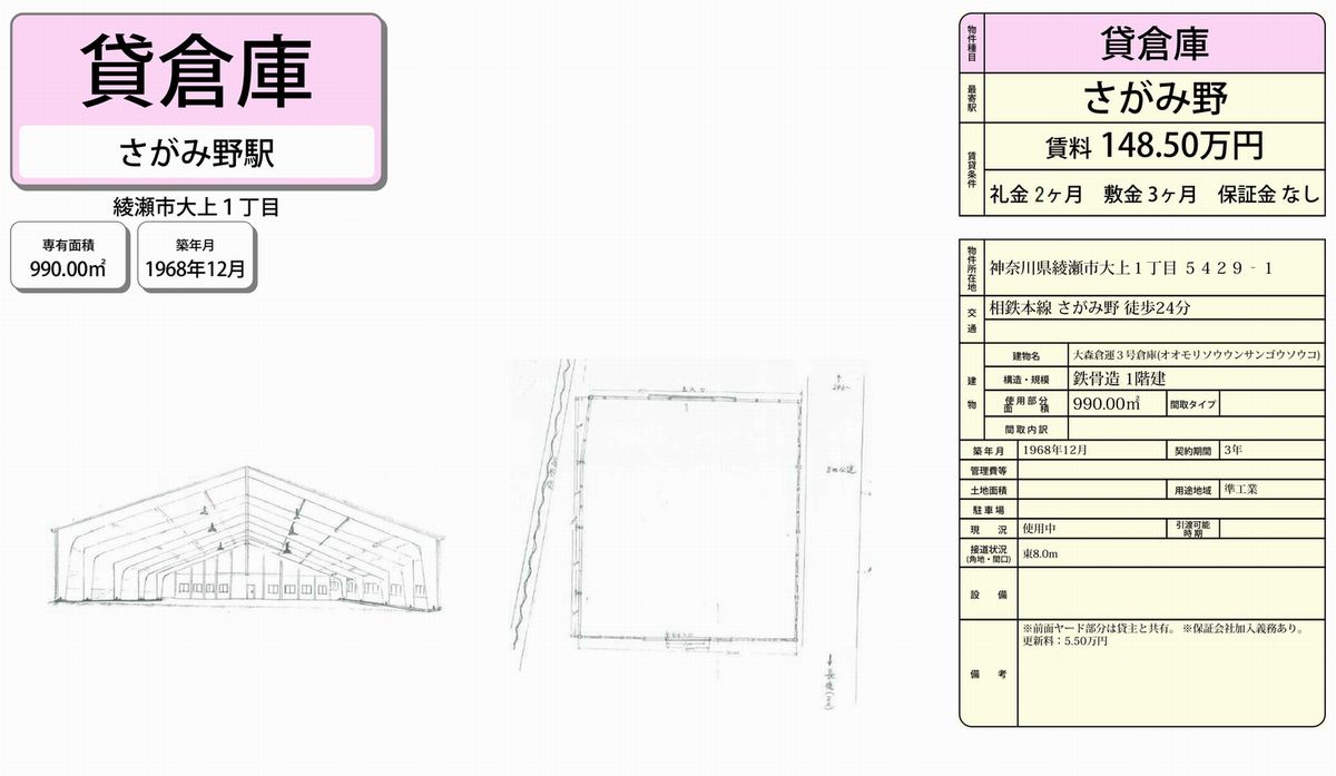 神奈川県綾瀬市大上1-5429-1 (さがみ野) 大森倉運3号倉庫 詳細データ