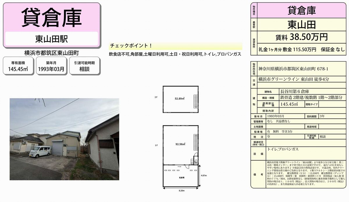 神奈川県横浜市都筑区東山田町678-1 (東山田) 長谷川第6倉庫 詳細データ