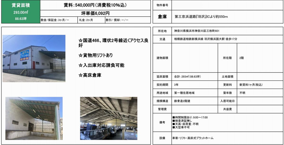 神奈川県横浜市神奈川区三枚町601 (羽沢横浜国大) 羽沢横浜国大 貸倉庫 詳細データ