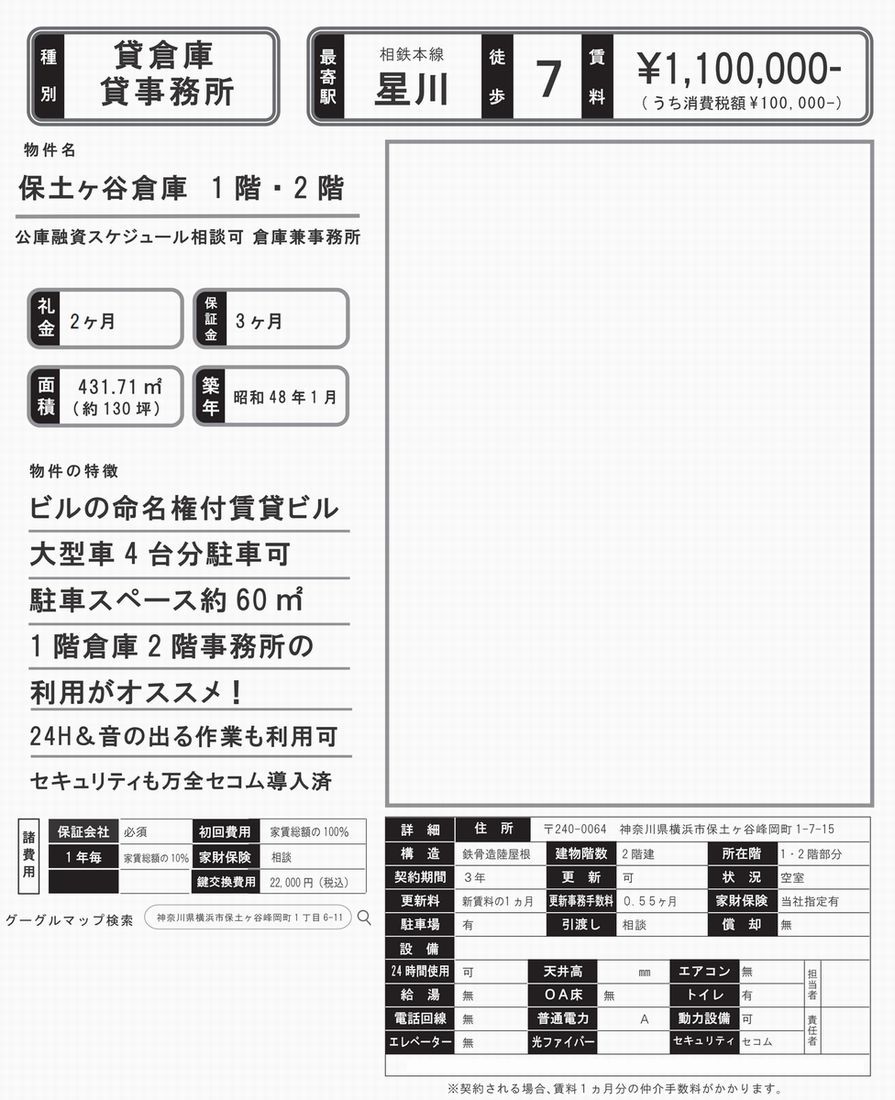 神奈川県横浜市保土ケ谷区峰岡町1-7-15 (星川) 保土ヶ谷倉庫 詳細データ