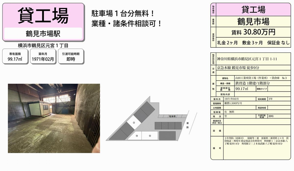 神奈川県横浜市鶴見区元宮1-1-11 (鶴見市場) 山田工業所貸工場3 詳細データ